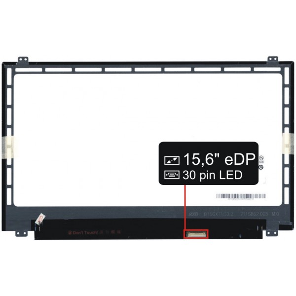 Základné údaje: lesklý povrch, veľkosť 15,6", rozlíšenie HD 1366x768, LED podsvietenie, 30 pinový LED konektor umiestnený na displeji vpravo dole (pri pohľade na zadnú stranu displeja).