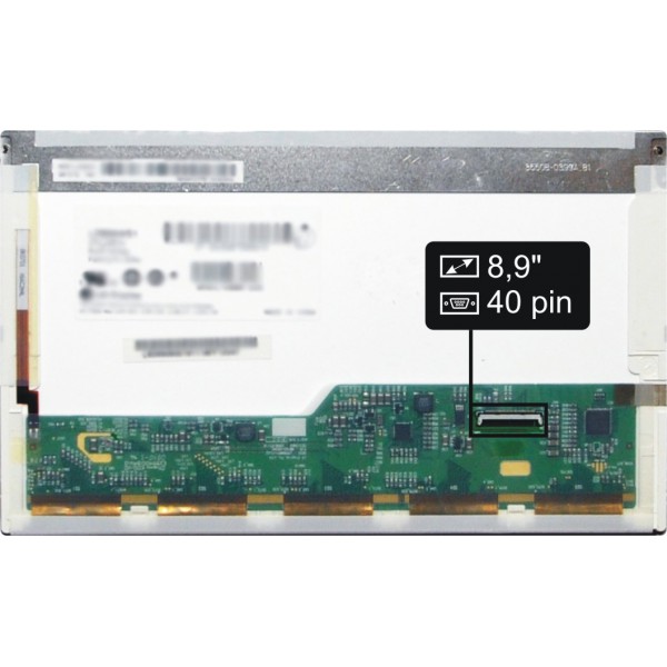 Základné údaje: veľkosť 8,9", rozlíšenie WSVGA 1024x600, LED podsvietenie, 40 pinový LED konektor umiestnený na displeji vpravo dole (pri pohľade na zadnú stranu displeja).