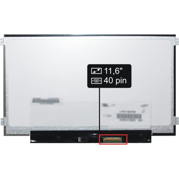 Základné údaje: lesklý povrch, veľkosť 11,6", rozlíšenie HD 1366x768, LED podsvietenie, Slim, 40 pinový LED konektor umiestnený na displeji vpravo dole (pri pohľade na zadnú stranu displeja).