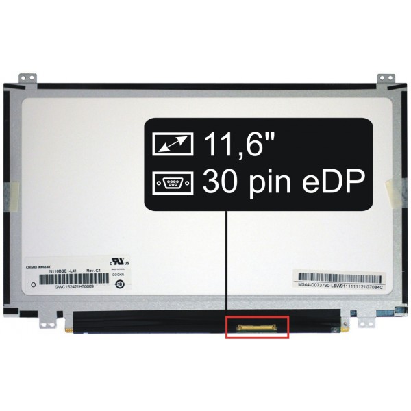Základné údaje: lesklý povrch, veľkosť 11,6", rozlíšenie HD 1366x768, LED podsvietenie, Slim, 30 pinový eDP LED konektor umiestnený na displeji vpravo dole (pri pohľade na zadnú stranu displeja).