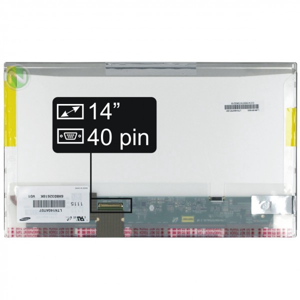 Základné údaje: veľkosť 14", rozlíšenie HD 1366x768, Lesklý povrch, LED podsvietenie, 40 pinový LED konektor umiestnený na displeji vľavo dole (pri pohľade na zadnú stranu displeja).