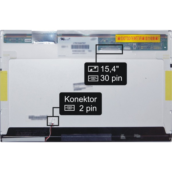 Základné údaje: veľkosť 15,4", rozlíšenie WSXGA 1680x1050, Lesklý povrch, CCFL podsvietenie, 30 pinový CCFL konektor umiestnený na displeji vľavo hore (pri pohľade na zadnú stranu displeja).