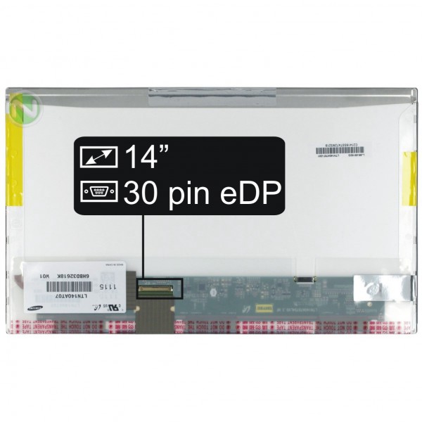 Základné údaje: veľkosť 14,0", rozlíšenie HD 1366x768, LED podsvietenie, Lesklý povrch, 30 pinový eDP LED konektor umiestnený na displeji vľavo dole (pri pohľade na zadnú stranu displeja).