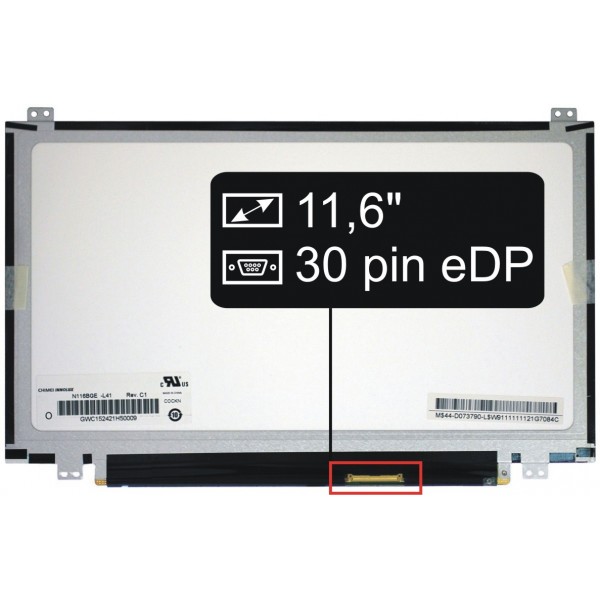 Základné údaje: matný povrch, veľkosť 11,6", rozlíšenie HD 1366x768, LED podsvietenie, 30 pin eDP LED konektor umiestnený na displeji vľavo dole (pri pohľade na zadnú stranu displeja).