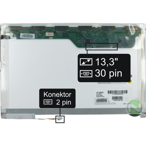 Základné údaje: matný povrch, veľkosť 13,3", rozlíšenie WXGA 1280x800, CCFL podsvietenie, 30 pinový CCFL konektor umiestnený na displeji vľavo dole (pri pohľade na zadnú stranu displeja).