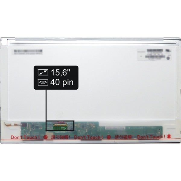 Základné údaje: matný povrch, veľkosť 15,6", rozlíšenie HD 1366x768, LED podsvietenie, 40 pinový LED konektor umiestnený na displeji vľavo dole (pri pohľade na zadnú stranu displeja).
