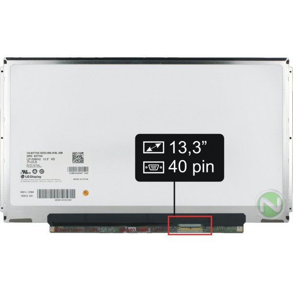 Základné údaje: matný povrch, veľkosť 13,3", rozlíšenie HD 1366x768, LED podsvietenie, 40 pinový LED konektor umiestnený na displeji vľavo dole (pri pohľade na zadnú stranu displeja).