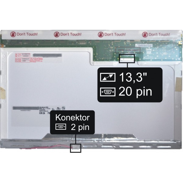 Základné údaje: matný displej, veľkosť 13,3", rozlíšenie WXGA 1280x800, CCFL podsvietenie, 20 pinový CCFL konektor umiestnený na displeji vľavo dole (pri pohľade na zadnú stranu displeja).