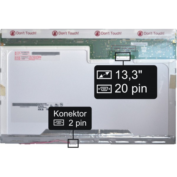 Základné údaje: lesklý povrch, veľkosť 13,3", rozlíšenie WXGA 1280x800, CCFL podsvietenie, 20 pinový konektor umiestnený na displeji vpravo hore (pri pohľade na zadnú stranu displeja).
